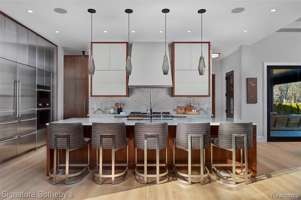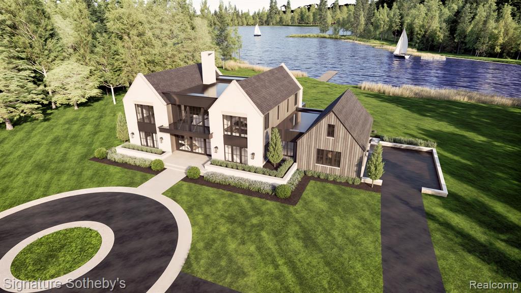 Crafted by La Marco Homes and thoughtfully designed by Krieger Klatt Architects, this to-be-built lakefront residence offers 5,473 square feet of refined living space with 4 bedrooms, 4.2 bathrooms, and approximately 100 feet of private frontage on the serene waters of Lake Angelus.The exterior has many of the hallmarks of a traditional home–gabled roof, paned windows, natural stonework–but with a number of contemporary twists, such as a custom steel porch and floor-to-ceiling glass offering uninterrupted views of the water. The open-concept floor plan is designed for seamless lakefront living. A foyer opens directly onto panoramic views and draws you towards a great room, the dining area and a chef’s kitchen equipped for both everyday function and elevated entertaining. A large butler’s pantry adds valuable prep and storage space, while the adjacent mudroom provides ample space for busy households. The first-floor primary suite is carefully positioned for privacy and views, featuring a spacious built-out closet and a spa-like ensuite bath. Upstairs, three additional bedrooms—each with its own ensuite bathroom—are complemented by a second-floor laundry and a large flex room with a private balcony. The three-car attached garage offers convenience and additional storage. Outside, a private patio overlooking Lake Angelus provides a stunning setting for outdoor dining, lakeside lounging, or simply taking in the tranquil water views in one of the region’s most exclusive locations. This is a rare opportunity to own a new custom home on Lake Angelus — a private, all-sports lake known for its peaceful setting, low boat traffic, and grand estates. |