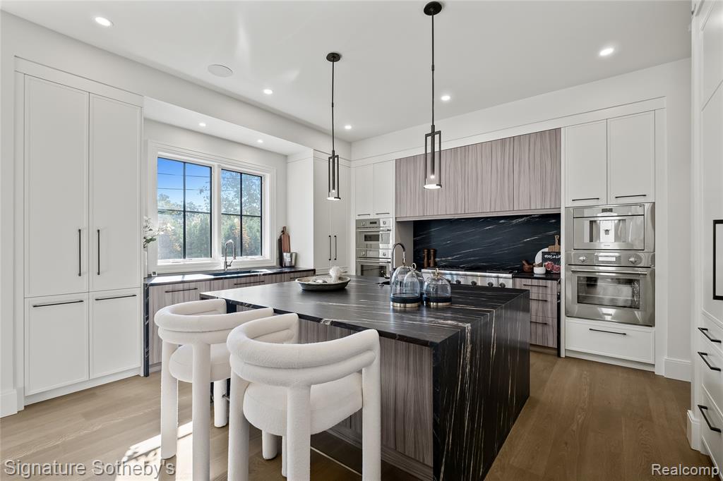 Offering 5 bedrooms, 5.2 baths, and 5,270 sq ft above grade with an addtl 2,003 sq ft of finished lower level, this Sterling Custom Homes residence combines scale with sophistication. Positioned on a .23-acre corner lot, the exterior blends stone and siding for a presence both timeless and modern. Inside, wide-plank hardwood flows through open interiors where natural light enhances layered textures and thoughtful design. Downsview cabinetry frames a chef’s kitchen appointed with Thermador appliances, integrated coffee maker, and a waterfall island topped in leathered granite. From the kitchen, a double-sided fireplace connects seamlessly to the living space, while a wet bar with waterfall counter anchors the entertaining experience. Glass sliding doors off the kitchen nook invite light and open to a landscaped yard with an aggregate patio and fire pit. A porcelain-tiled wine room complements the formal dining space, while a private office provides retreat. Upstairs, the primary suite impresses with a tray ceiling, private fireplace, expansive walk-in closet, and a spa-inspired bath featuring dual vanities, soaking tub, and steam shower. Secondary bedrooms each enjoy their own en-suite bath, creating comfort and privacy throughout. A spacious loft adds flexibility, ideal as a second office, study space, or play area. The finished lower level continues the lifestyle with hardwood flooring, a full bar, guest suite, additional bath, and a flex room ready for fitness or a golf simulator. Everyday convenience is elevated through Control4 automation, security cameras, and a heated two-car garage with epoxy flooring. A residence crafted with precision, balancing architectural presence with functional ease, designed for both grand entertaining and comfortable daily living. |