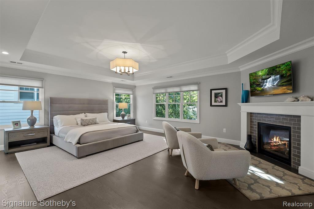 Each bedroom is ensuite, designed with comfort and functionality in mind. Upstairs, four spacious bedrooms converge around a versatile loft that adapts easily to office or rec space. The primary suite elevates daily living with a vaulted ceiling, private fireplace, expansive walk-in closet, dedicated vanity, and a spa-like bath featuring dual sinks, soaking tub, and separate shower. The fifth suite is in the newly finished lower level, where a wet bar with quartz counters, refrigerator, and island seating offers a refined retreat for entertaining.